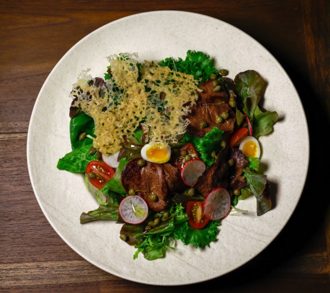 Salad with grilled beef tenderloin, quail eggs, cherry tomatoes, capers, and parmesan crisps. Served with vitello tonnato sauce.