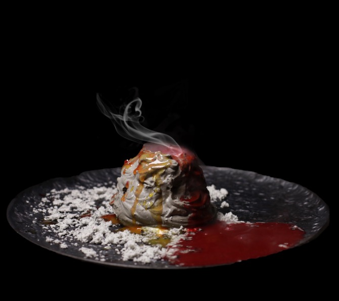 Delicate meringue with mascarpone cream and fresh mango, topped with raspberry and passion fruit sauce. Liquid nitrogen adds a magical volcanic eruption effect.