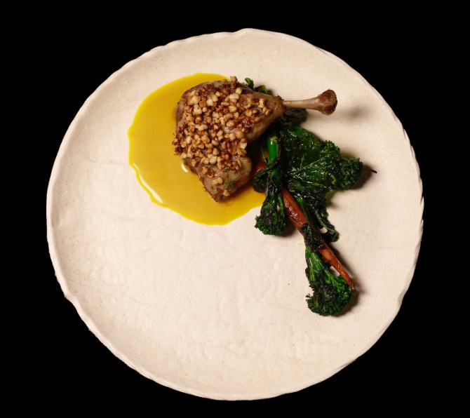 Slow-cooked duck leg confit with nicolini, confit carrots, pumpkin and rose sauce, and buckwheat popcorn.