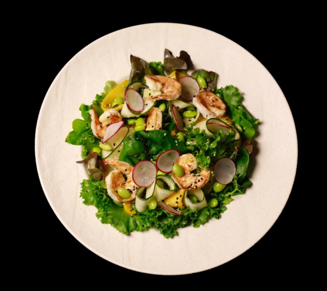 Salad with grilled shrimp, zucchini slices, mango, passion fruit dressing, sesame seeds, and edamame beans.