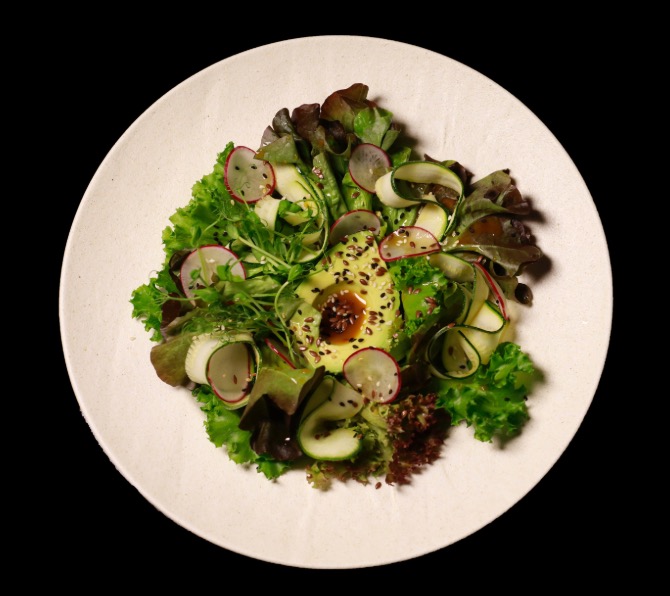 Salad with avocado, zucchini slices, radish, sesame seeds, and aromatic passion fruit dressing.