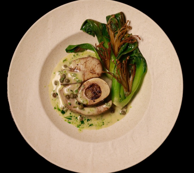 Baked cobia in miso glaze, served with bok choy, enoki mushrooms, and caper beurre blanc sauce.
