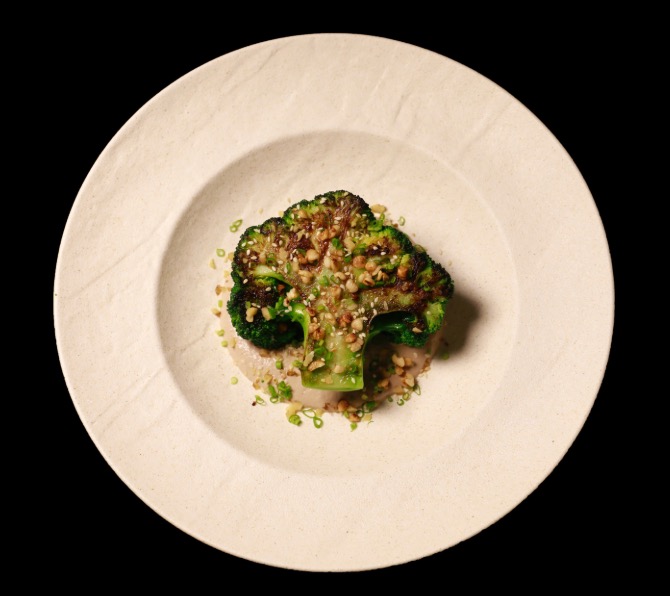 Grilled broccoli served with walnut sauce, buckwheat popcorn, and sesame seeds.